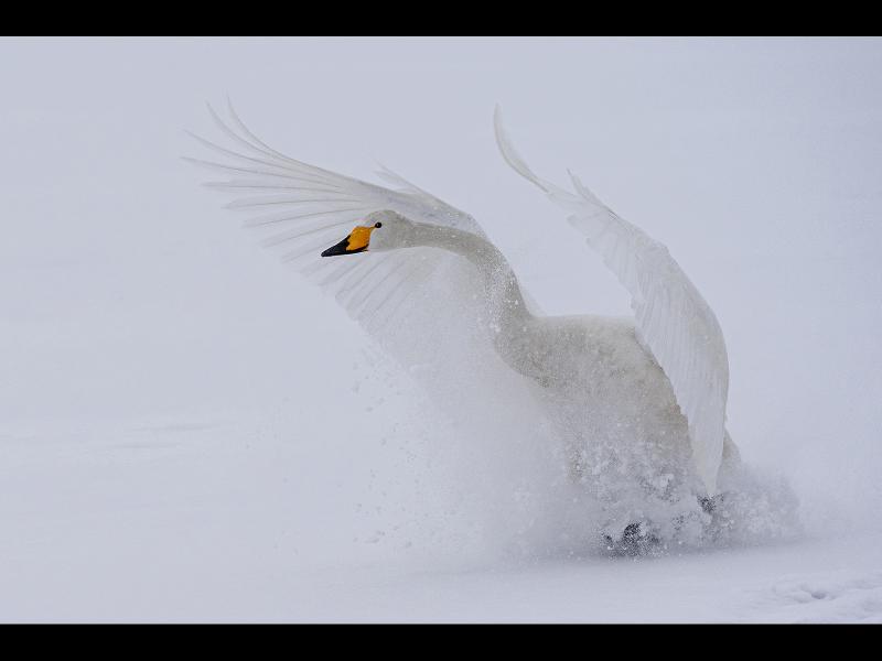 Whooper Swan landing on snow